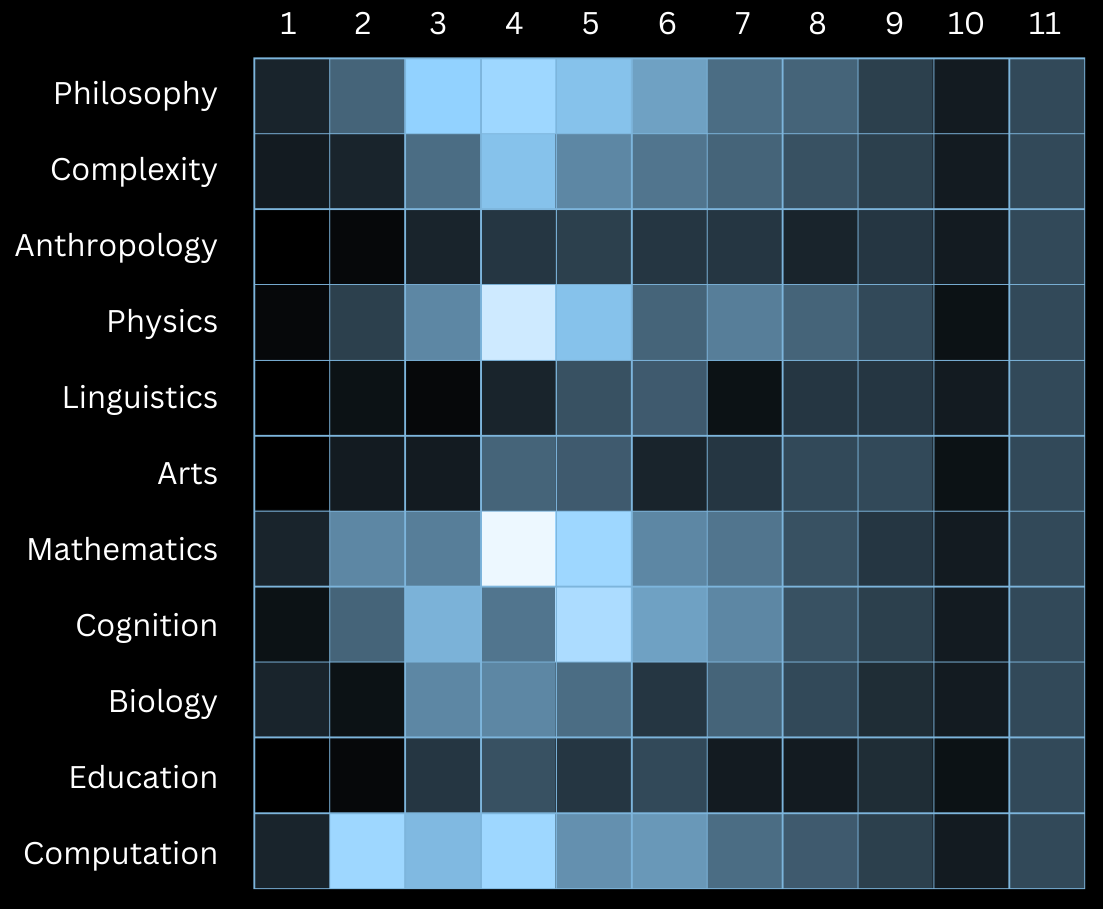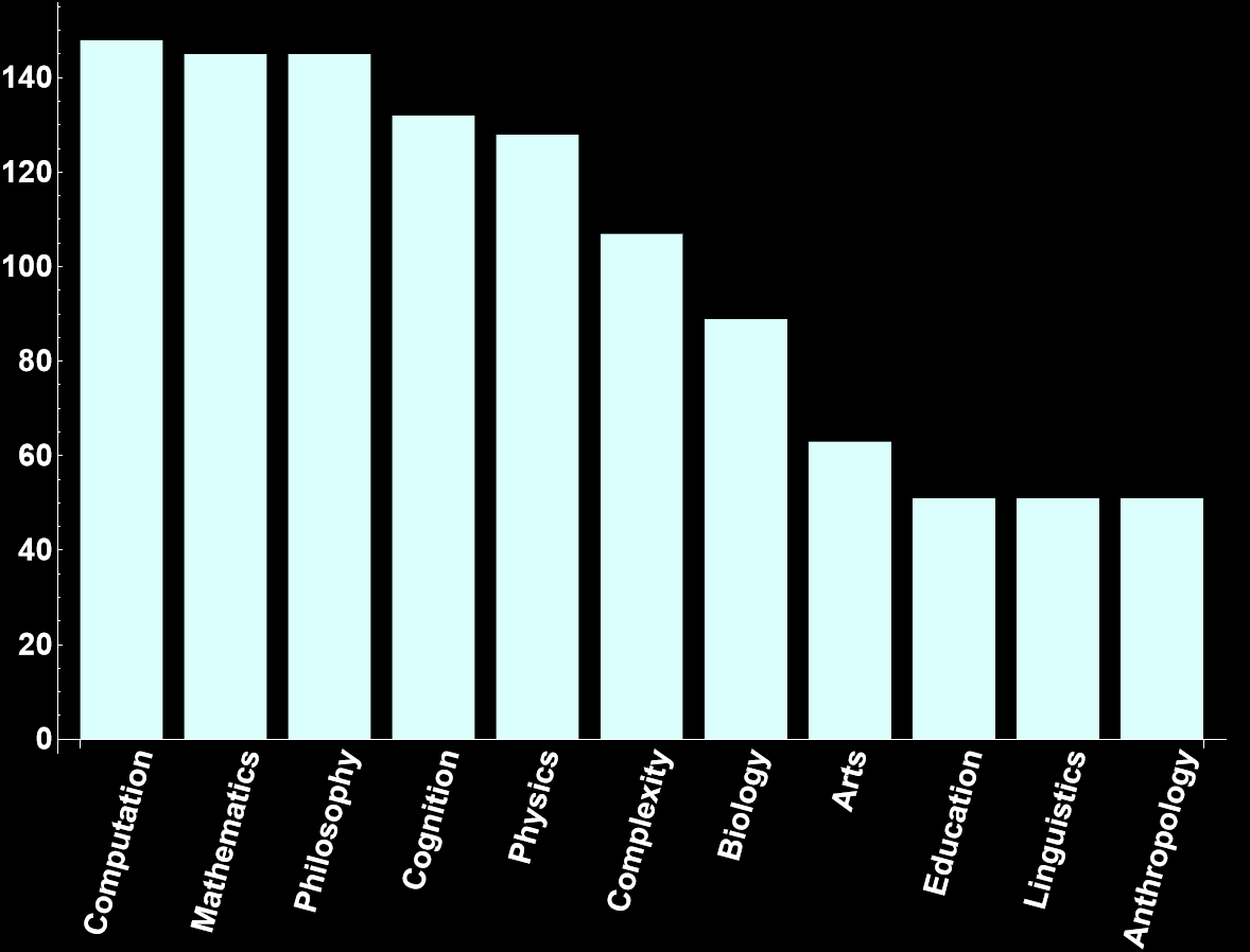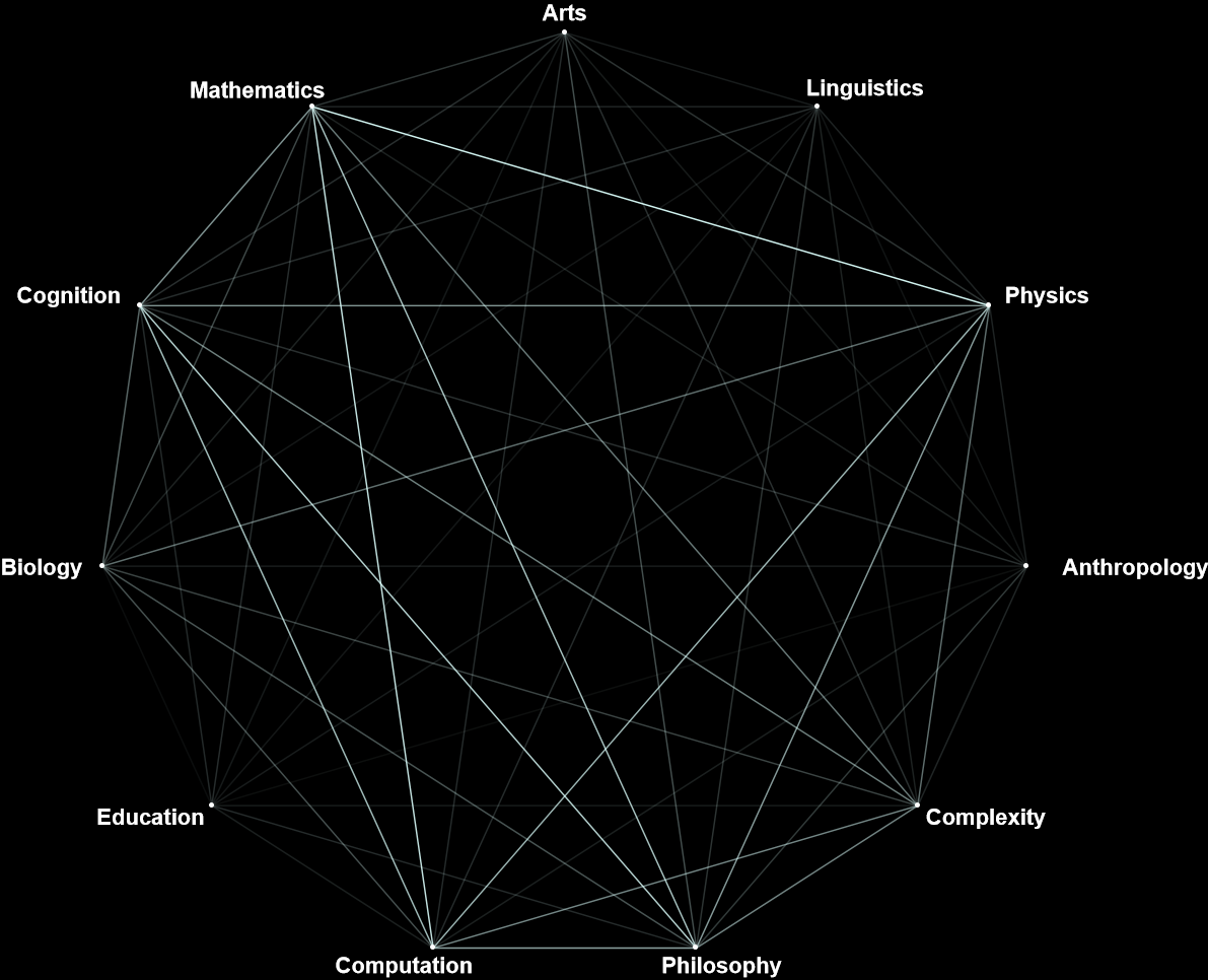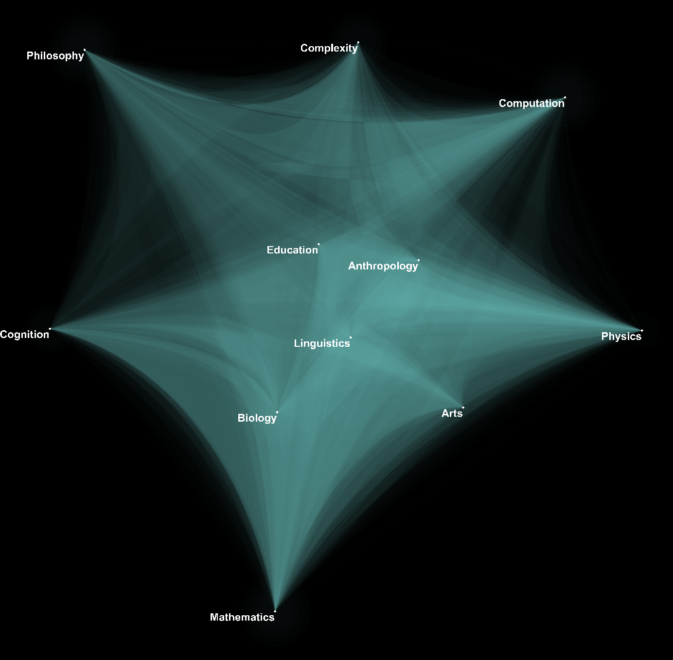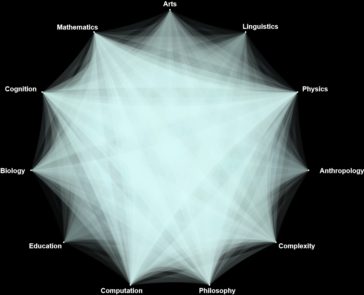 Complete dataset generated from participant answers to ‘What disciplines better represent your research activity or interests?’. Each datapoint is a shape (hyperedge) connecting some collection of disciplines. Shade intensity is proportional to the number of datapoints in that region of the diagram.