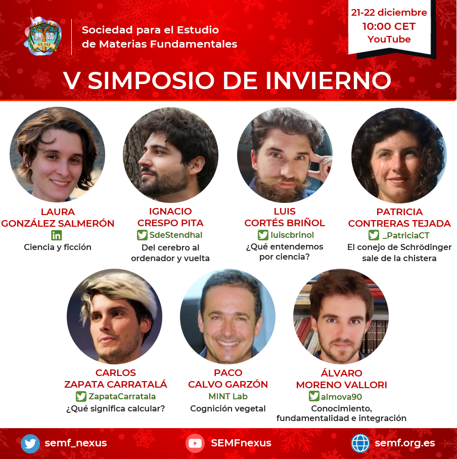 El V Simposio de Invierno se celebró los días 21 y 22 de diciembre de 2020 en nuestro canal de YouTube, contando en esta ocasión con exposiciones y conversaciones sobre filosofía de la ciencia, cognición vegetal, metamatemática, ciencia y literatura, física cuántica, neurociencia y epistemología, tal y como puede consultarse en el programa, desde el que puede accederse a los vídeos de las charlas.
