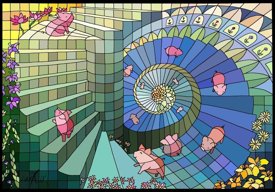 Piggies and the dimension Warp (Digital art) Escheresque reimagining of porcine dimension theory.