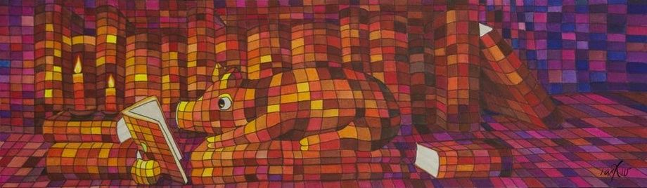 Red Squares Piggy (Brush markers on paper) Celebrating the intelligence of pigs in a 3D-grid technique inspired by Paul Klee’s studies of colour and form.